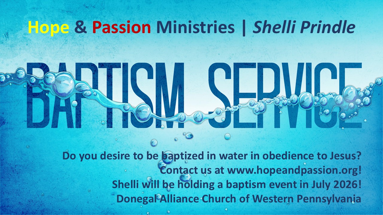 Donegal Christian & Missionary Alliance Church 210 Loyalhanna St., Donegal, PA, United StatesDo you desire to be baptized in water in obedience to Jesus? Contact us at www.hopeandpassion.org or e-mail us a hope.passion.ministries@verizon.net! Shelli will be holding a baptism event in July Read More