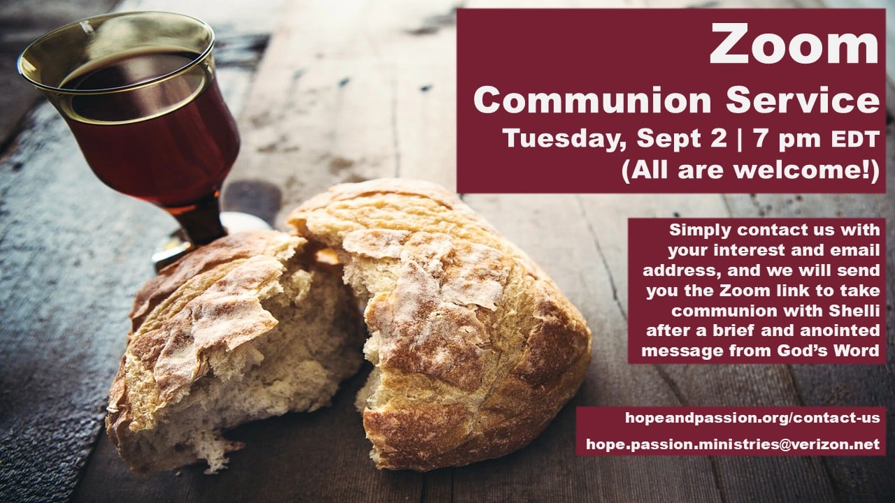 We would love you have you join us for our Zoom Communion Service at 7:00 pm EDT. Simply contact us at hope.passion.ministries@verizon.net with your interest and e-mail address, and we will send you the Zoom link to take communion with Shelli after a brief and anointed message from God's Word. |